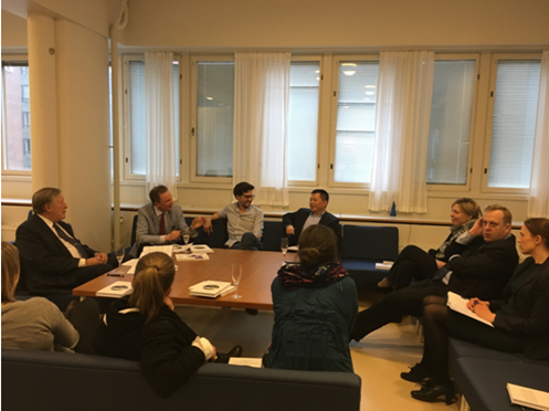 2017年4月25日,我院青年教师杜军强博士应邀参加芬兰最高行政法院荣休院长、芬兰法治 (ROLFI)创建人Pekka Hallberg所著《法治与可持续发展》一书的新书发布会,并作为评论人发言。该新书发布会在赫尔辛基大学九州体育在线,九州体育在线(中国)大楼2楼会议室举行,由赫尔辛基大学九州体育在线,九州体育在线(中国)院长Kimmo Nuotio 主持,另一评论人Guilherme研究员、中国法中心主任 Ulla Liukkunen教授以及多名其他研究人员并博士生参加发布会。