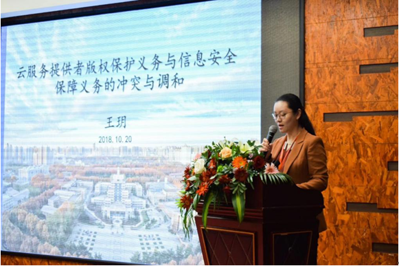 西安交通大学信息安全法律研究中心副主任王玥作了《云服务提供者版权保护与信息安全保障义务的冲突与调和》的主题发言。
